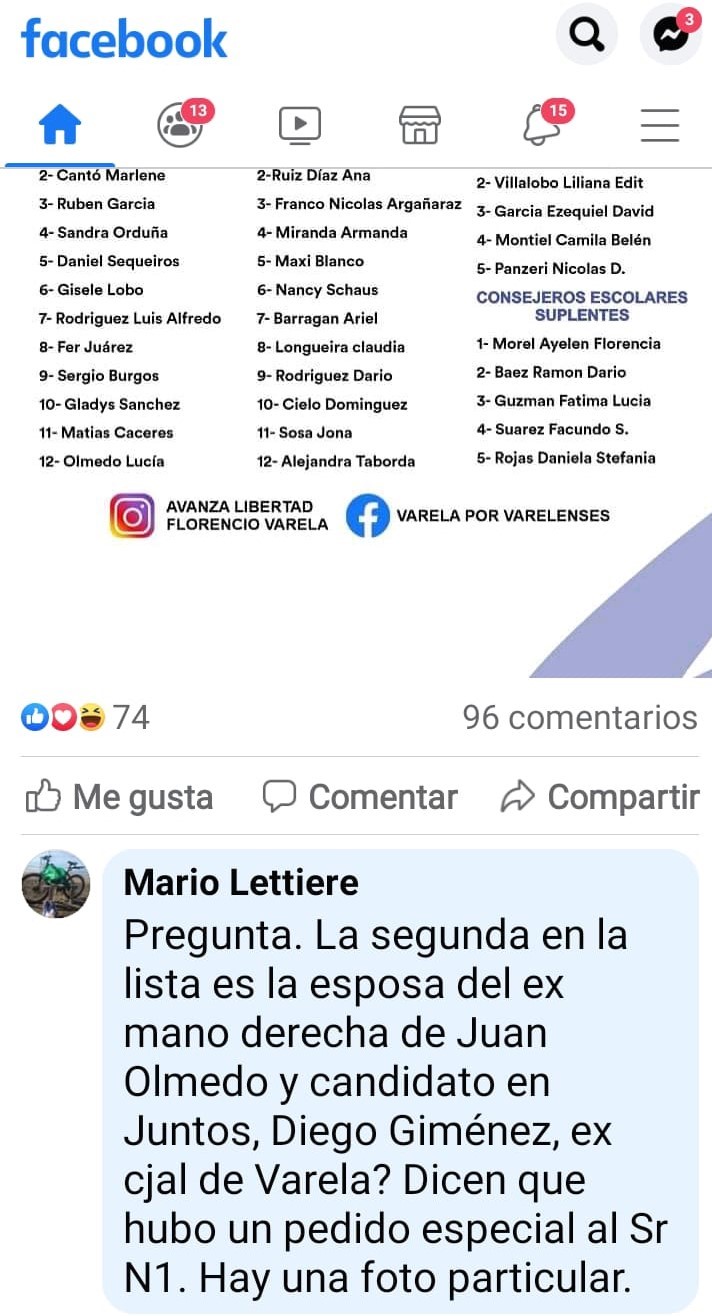 Lettieri consultó a Ezequiel “Chamu” Taborda, que encabeza la lista de candidatos a concejales de Avanza Libertad, si era cierto que Giménez le había pagado para que incluyera a su mujer como compañera de fórmula. Lettieri guarda las capturas de ese diálogo, a las que El Cohete accedió en forma completa.