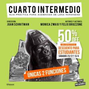 Entre la historia colectiva e individual, Bruzzone apela a hurgar en la “papelera de reciclaje” de la información, de apelar al humor, a lo didáctico. “Más allá de que todo lo que decimos sea estrictamente fiel a los hechos, hay una selección de elementos que pone las cosas todo el tiempo al borde de lo inventado. Incluso durante la audiencia que ponemos en escena, que es un recorte textual de una audiencia que tuvo lugar durante el juicio ESMA 3, hay momentos en los que las preguntas de los abogados defensores y las respuestas del testigo parecen inventadas. Nada es inventado. Nosotros creemos en el Planeta de los simios y hablarles a los monos del futuro nos parece de lo más razonable. Sin embargo hoy, justamente por el contexto, creemos que Cuarto Intermedio podría leerse más como una interpretación de todo lo que rodea a los juicios de lesa humanidad”, piensa el escritor, autor de novelas como Los topos, Campo de Mayo y 76.