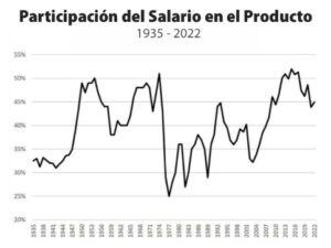 La Argentina no fue ajena a estos cambios globales, aunque la preexistencia y la vigencia del peronismo les imprimieron características particulares. Posiblemente la más importante es la alternancia de modelos de conducción de las políticas nacionales. Durante los períodos en que el peronismo ejerció la presidencia, la política condujo a la economía. Por el contrario, cuando el gobierno quedó en manos de gobiernos carentes de legitimidad política, de dictaduras cívico-militares, e incluso de gobiernos no peronistas electos por vía democrática, la conducción del poder resultó invertida, con la economía conduciendo a la política. Esta alternancia en el manejo del poder por la política o por los poderes fácticos de la economía dio lugar a los avances y los retrocesos en el desarrollo nacional y al cambio de los principales beneficiarios de los respectivos gobiernos. Esos avances y retrocesos fueron palmariamente demostrados por Cristina Fernández de Kirchner en sus recientes discursos en la UOM y en la conmemoración del Día de la Soberanía con el gráfico que se muestra a continuación.