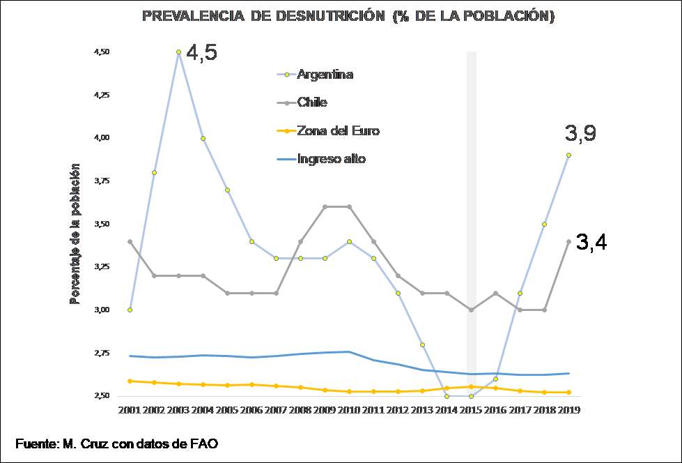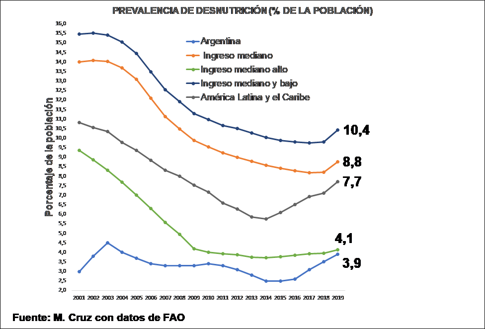 El economista Manuel Cruz, en unos papeles de trabajo que empezaron a circular entre colegas semanas atrás (pero que aún no han sido publicados), al analizar la evolución de la desnutrición en la Argentina da cuenta de que, entre 2001 y 2003, el porcentaje de la población desnutrida aumentó 50%, desde 3% a 4,5%. Sin embargo, desde ese año fue disminuyendo rápidamente hasta 2007, estabilizándose hasta 2011 alrededor de 3,3% para luego disminuir cada año hasta 2014/15, que se ubicó por debajo de 2,5%. Lamentablemente, en 2016 se revierte esta tendencia y se produce una subida abrupta, llegando a 3,9% de la población en 2019 (superando el 3,8% del 2002). Entre 2003 y 2015 la población total de la Argentina aumentó 14%. Entre 2016 y 2019 la población creció 3%.