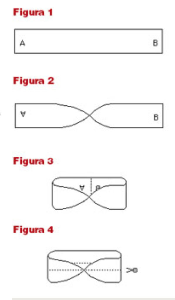 Sigo. Ahora tome la cinta del extremo A y dóblela como se ve en la figura 2. No la rompa, sólo tuerza 180 grados uno de los extremos.