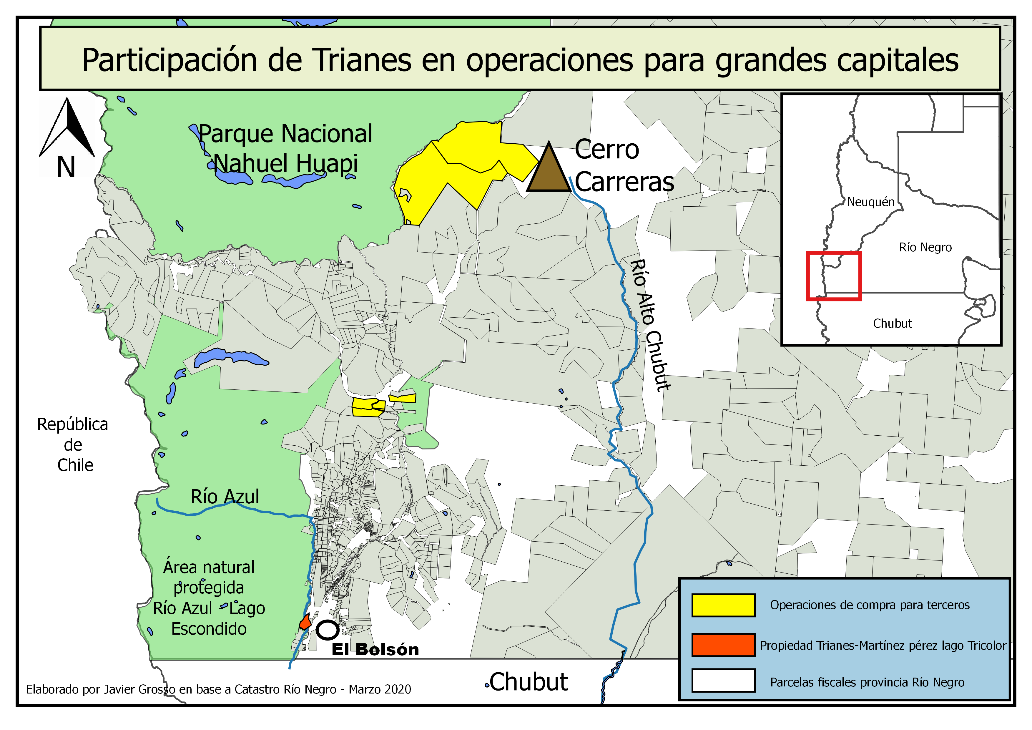 Por décadas fue muy activa en el fuero local, años en los que compró cuatro parcelas que suman cerca de quince mil hectáreas ubicadas a pocos kilómetros al norte de General Roca, junto a la ruta nacional N°6. En 2005 dos personas de Bariloche mensuraron las tierras, que tres años después ya eran propiedad de Trianes.