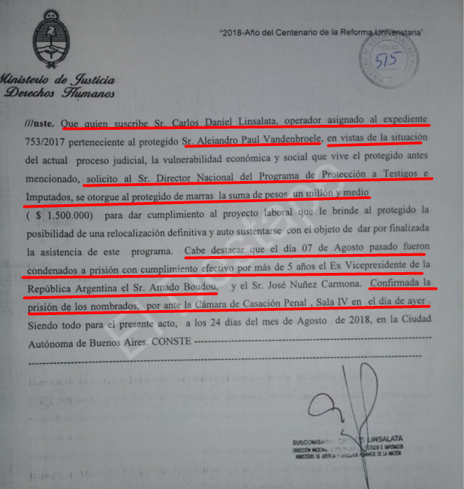 Pero la Casación no atendió razones y nunca tuvimos acceso al expediente. Hasta febrero de 2020, cuando un periodista publicó parte de ese documento. La parte donde se demostraba que la colaboración de Vandenbroele no había sido prestada sino propiamente comprada por el Estado nacional. Y además nos enteramos que le habían pagado por la prisión de Amado Boudou. Vanderbroele nunca había sido testigo arrepentido en la causa en la que se condenó a Amado. De hecho, fue condenado en la misma causa. Pero esto pasaba en esos días en las entrañas del gobierno de Macri.