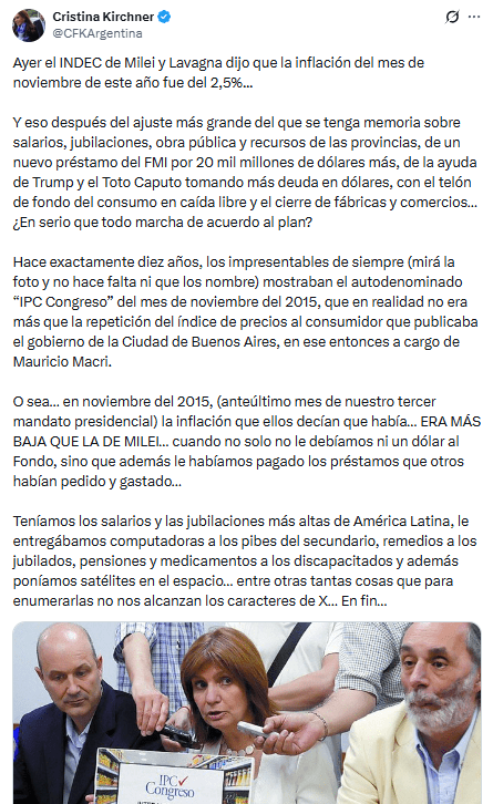 Otro fiasco que recibió el gobierno es explicado en detalle por Lucka Glezer en esta edición del Cohete. Se trata de una falsa "salida al mercado", que obtuvo menos dinero del buscado y elevó la tasa de interés para cualquier refinanciamiento o nuevo préstamo futuro. Además, el Índice de Precios al Consumidor trepó por séptimo mes consecutivo, con 2,5% en noviembre. Por encima del último registro del gobierno de la ex Presidenta CFK, que lo comentó así: