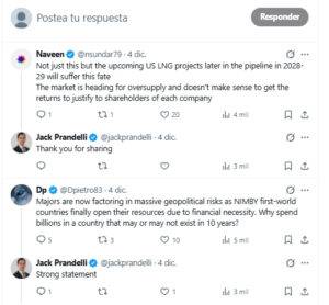 El primero dice que los proyectos en Estados Unidos para 2028 y 2029 sufrirán el mismo destino. El mercado va hacia la sobreoferta y no producirá beneficios para los accionistas de todas las compañías. El segundo se refiere al riesgo geopolítico masivo que están considerando las grandes empresas, debido a que los países del Primer Mundo abren sus recursos, por necesidad financiera. "¿Por qué exponer miles de millones de dólares en un país que tal vez dentro de diez años no exista?" (sic).