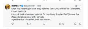 Recuerda The Merchant que Petronas se fue en 2024, y ahora se va Shell. Es decir que en dos años se fueron dos pilares globales. Axel Kicillof atribuyó a Milei la decisión de Petronas de abandonar su proyecto en Bahia Banca para trasladarlo a Río Negro. Pero tampoco se quedó allí. Luego el hombre que Techint le prestó a Milei para conducir YPF, Horacio Marín, anunció con bombos, platillos y abundante humo que el proyecto quedaría en manos de Shell. Ahora que también los bajobritánicos se han borrado, Prandelli se pregunta cómo sigue la historia, y contempla tres hipótesis: