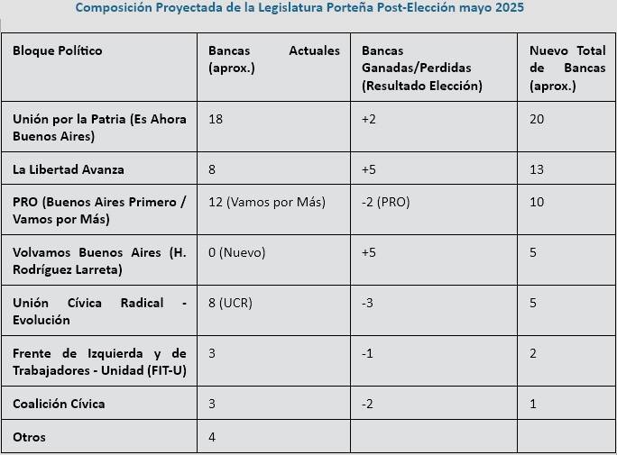 La nueva configuración de la Legislatura porteña presenta un escenario más fragmentado y complejo para el jefe de Gobierno, Jorge Macri. Según las proyecciones, Unión por la Patria se consolidaría como el bloque mayoritario con 20 bancas. La Libertad Avanza contaría con 13 escaños. El PRO tendría 10 legisladores y el nuevo espacio de Rodríguez Larreta tendría cinco. La UCR vería reducida su representación a cinco bancas, mientras que el Frente de Izquierda mantendría dos.