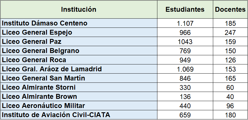 Al 30 de junio, según fuentes militares, estas instituciones cuentan con la siguiente cantidad de docentes y estudiantes: