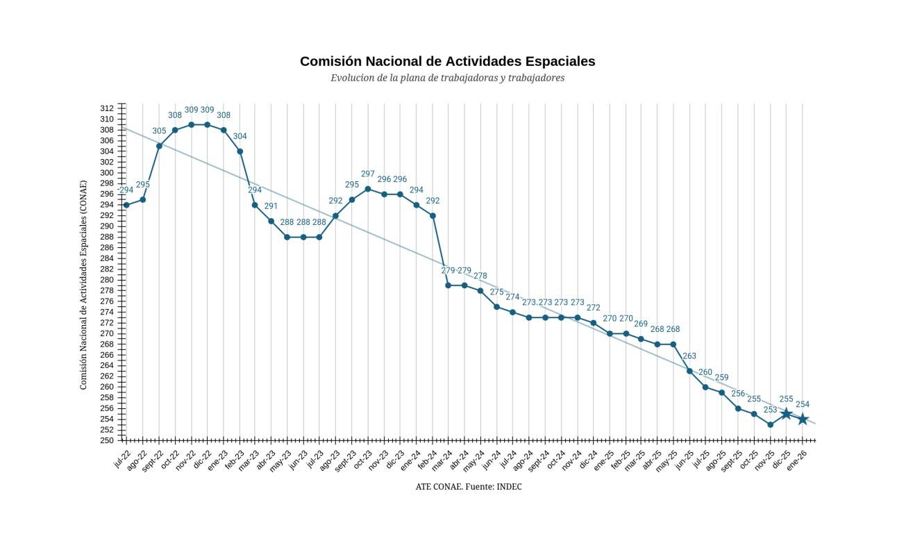 Tomando los registros reconocidos por el INDEC, ATE CONAE graficó la drástica reducción de la planta.