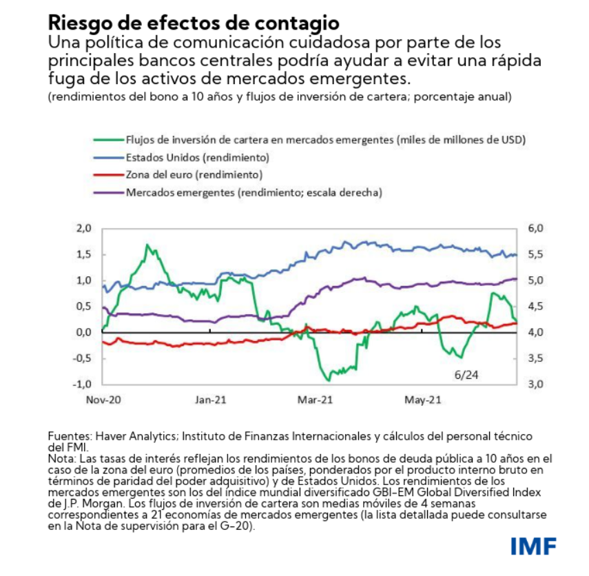 El mundo también observa atentamente el reciente repunte de la inflación, en particular en Estados Unidos. Sabemos que la acelerada recuperación estadounidense beneficiará a muchos países al incrementar el comercio; además, las expectativas de inflación se han mantenido estables hasta ahora. Sin embargo, existe el riesgo de que la inflación o las expectativas de inflación aumenten de forma más sostenida, lo que exigiría un endurecimiento de la política monetaria en Estados Unidos antes de lo previsto. Otros países afrontan desafíos similares como consecuencia de las subidas de precios de las materias primas y los alimentos.