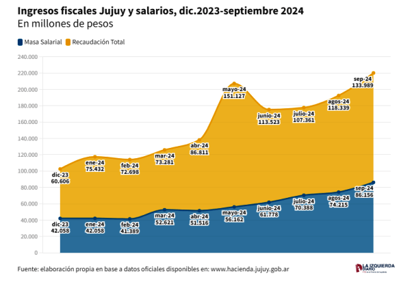 Ese conflicto corporiza lo que los números narran. El economista y docente universitario Gastón Remy, que en 2023 estudió en profundidad el endeudamiento jujeño, analizó la situación fiscal de la provincia y encontró que el superávit logrado en el primer semestre del año —de 280.000 millones de pesos— equivale al 93% de la masa salarial del sector público y evidencia un ritmo de crecimiento superior al de ella. La evolución de los salarios estatales va quedando relegada también respecto de los ingresos fiscales. Diputado provincial por el PTS-FITU, Remy volcó la comparación a este cuadro que elaboró para La Izquierda Diario: