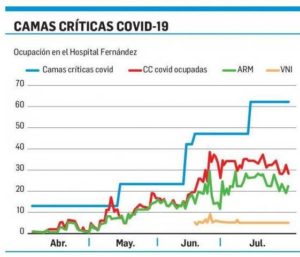 Un médico intensivista del Hospital Fernández, con el mismo temor de sufrir represalias por su testimonio que me han manifestado otros trabajadores de salud de la Ciudad con los que conversé, cuestionaba las declaraciones del director de su hospital que sostenían que ese establecimiento tenía 66 camas de terapia intensiva aunque sólo el 65% de ellas estaban ocupadas y que por tanto el riesgo de colapso en la Ciudad era muy bajo (Ámbito, 7/8). Ese médico detallaba la situación del parte diario del 10 de agosto en cada una de las 22 camas ocupadas de las UTI B y C para Covid, y en las 13 de las UTI A y D para no Covid, más otras 4 de ventilación mecánica no invasiva (VNI). Un total de 39/44. Y afirmaba que en su máxima expansión el hospital podía llegar a 50 camas pero nunca a 66. Siendo así, esta sería una explicación más para los números que no cierran: contar más camas que las disponibles (curva celeste).