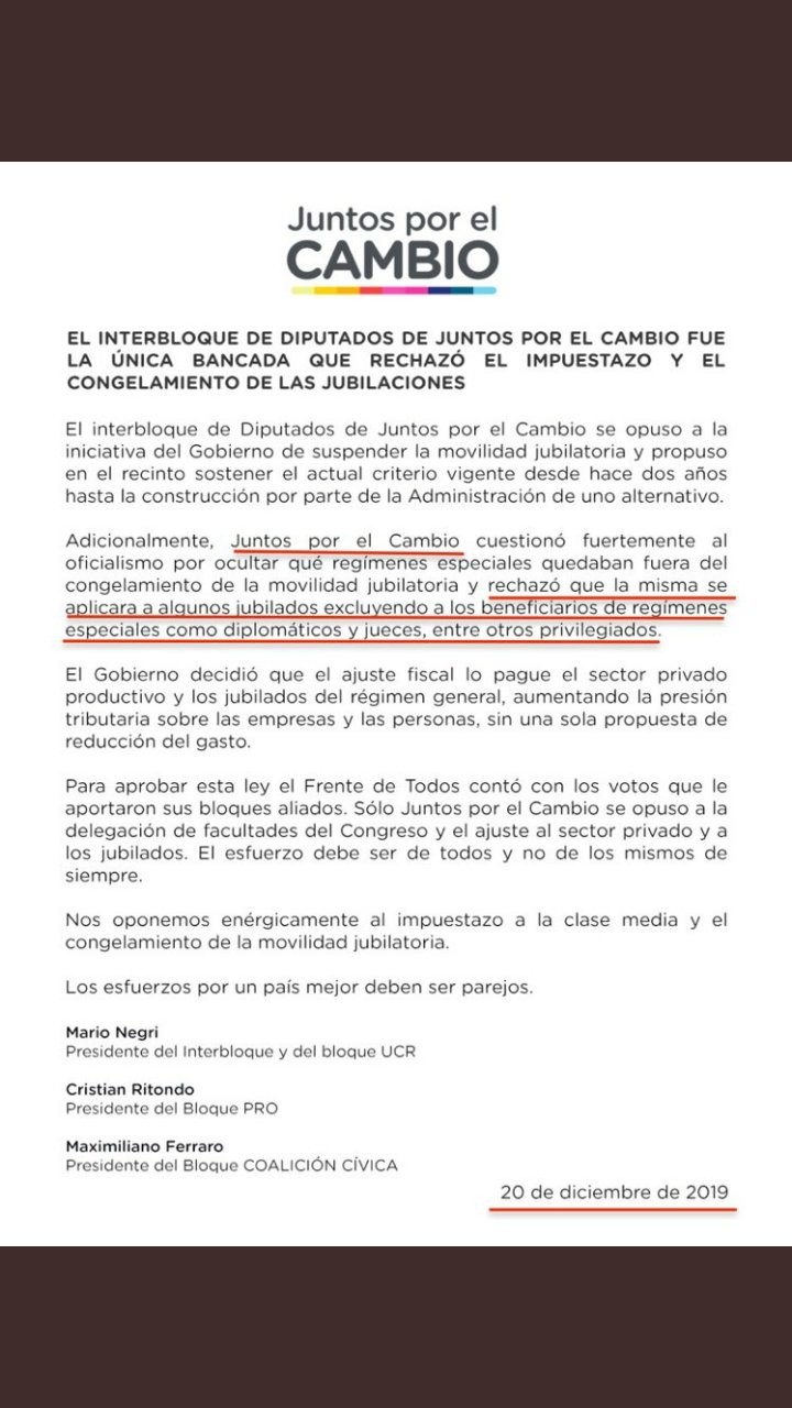De la oposición sólo puedo decir culebras y demonios. El 20 de diciembre de 2019 votaron en contra del proyecto que suspendió por inaplicable la movilidad jubilatoria que había implementado el macrismo. Dice el comunicado que Juntos por el Cambio rechazaba la suspensión entre otras cosas porque el congelamiento no se aplicaría a los regímenes especiales “como diplomáticos y jueces”.
