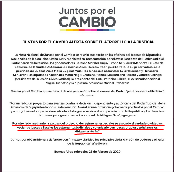 Esta semana que pasó, mientras los personajes de Juntos por el Cambio intentaban que fracasara la sesión en Diputados, donde se le dio media sanción al proyecto que modifica el régimen de jubilaciones propuesto por el Poder Ejecutivo, Juntos por el Cambio señaló que “mediante la excusa del proyecto de regímenes especiales se esconde el verdadero objetivo: vaciar de jueces y fiscales los estamentos judiciales y colonizarlos con jueces propios”.