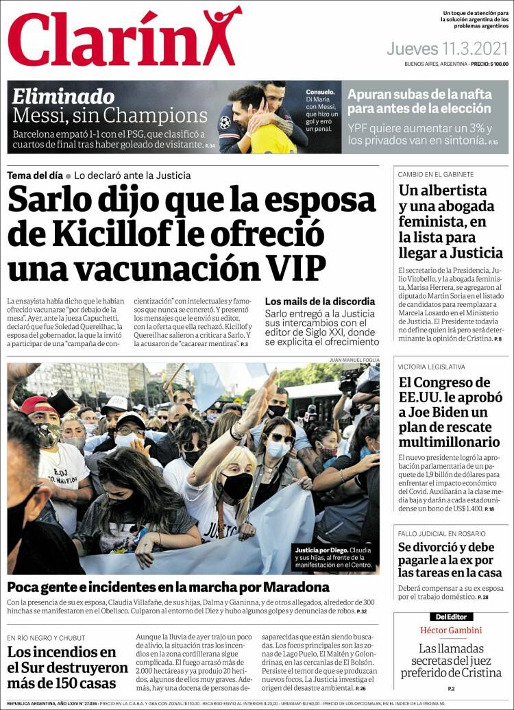 Su práctica de los últimos años era tirar cualquiera en tipografía catástrofe y con el tiempo, cuando se imponía que el dato era falso, no rectificar nada o hacerlo con pocas líneas en una página par del fondo. Pero no recuerdo que haya persistido en publicar una tapa mentirosa después de que el dato hubiese sido desmentido, y difundidas ampliamente las pruebas de que se trataba de un infundio. (Impresiona la lucidez en caliente del gobernador Kicillof, que la noche del miércoles se preguntó en televisión: "La tapa de Clarín, mañana, ¿va a decir que no fue una vacuna por abajo de la mesa? ...Para mí la tapa de Clarín va a ser muy desfavorable, sobre la base de una mentira".) En su sucesión dramática, el derrape de la tía Betty y la tapa kamikaze de Clorín anuncian que esta etapa de la guerra sucia —etapa agónica, de un proyecto de país para pocos que actúa como gato acorralado— tendrá por característica la política del bonzo, que protestaba públicamente prendiéndose fuego. Desprovistos de mejores herramientas, los generales civiles de la guerra sucia no dudarán en enviar a los recursos que les quedan —ya se trate de personas o medios— a prenderse fuego, con tal de que, al incendiarse, arrebaten también a algún adversario.