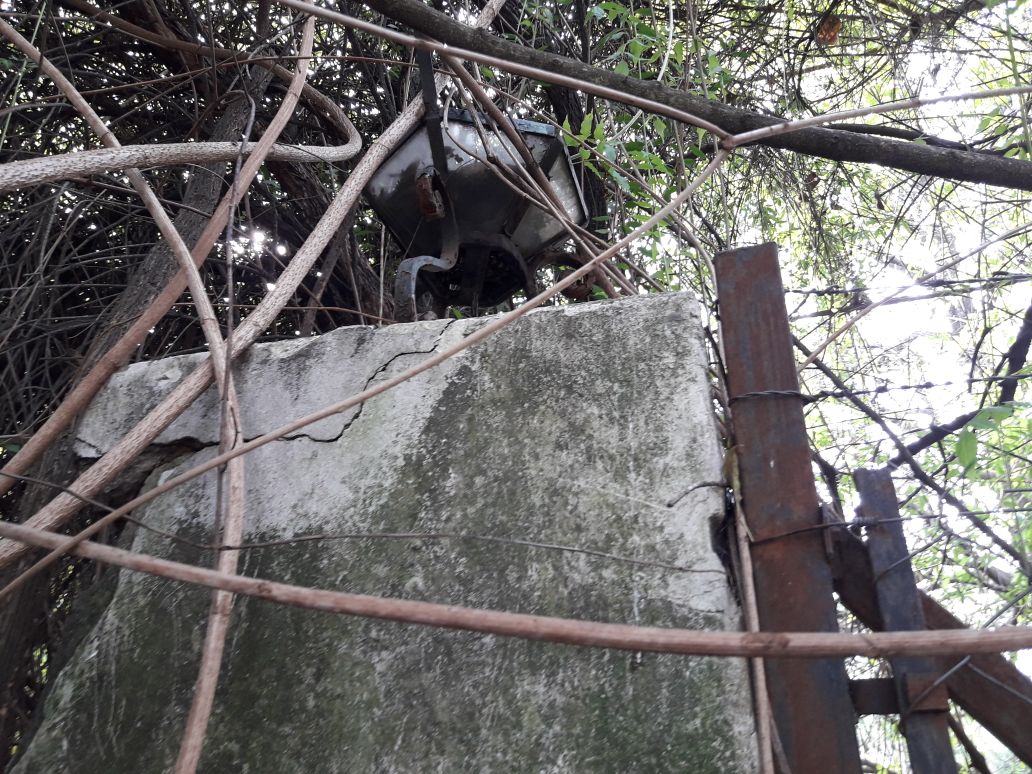 Doblando la esquina, encontró todo como abandonado, con una maraña medio selvática. Y allí observó entre las marañas una cancela de hierro con dos pilares y una farola muy abandonada y antigua absorbida por la vegetación.