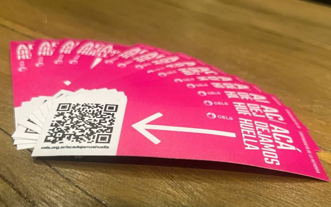 El CELS presentó esta semana "Acá dejamos huella", su cartografía de la memoria, con una señalización en color lila y una flecha blanca que señala un código QR para escanear en pos de conocer dónde se está parado y qué historia de lucha hay para considerar.