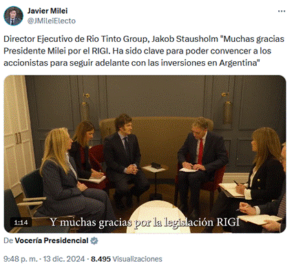 A su vez, la empresa Arcadium fue comprada por la empresa anglo-australiana Rio Tinto —adquisición que se completó a comienzos de marzo de 2025—, una transacción de 6700 millones de dólares. Jakob Stausholm, director ejecutivo de Rio Tinto Group, le agradece a Milei “por la explicación en detalle del RIGI”.