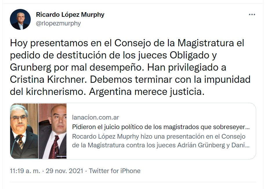 En la Argentina la defensa de los valores republicanos se ha convertido en la señal de identidad de algunos partidos políticos, al punto que han incorporado la palabra “republicanos” en sus siglas, y en sus bases programáticas consideran que “es imprescindible contar con una Justicia independiente”. Sin embargo, su práctica no guarda coherencia con los principios proclamados. En 2015, cuando el juez Daniel Rafecas dispuso el archivo por inexistencia de delito de la denuncia que el fiscal Alberto Nisman había formulado contra la entonces Presidenta de la República, se produjo una reacción furibunda de algunos destacados intelectuales republicanos, que en una solicitada consideraron “un deber cívico reclamar la destitución, acorde con los procedimientos vigentes, del juez Daniel Rafecas, por manifiesta inconducta en el ejercicio de la magistratura”. La solicitada fue acompañada de un pedido formal efectuado ante el Consejo de la Magistratura por el diputado de PRO (Propuesta Republicana) Waldo Wolff. En estos días, el sobreseimiento de los imputados en la causa Hotesur-Los Sauces, dictado por dos camaristas del Tribunal Oral Federal (TOF) 5, ha desatado una competencia similar por utilizar la descalificación más sonora. Como es habitual, encabeza la lista Elisa Carrió, para quien “hay dolo en la conducta de los jueces e iremos por su juicio político cuando llegue el momento”. Este anuncio motivó que los dirigentes del partido Republicanos Unidos, liderado por Ricardo López Murphy, se presentaran ante el Consejo de la Magistratura para reclamar “la apertura de una investigación por mal desempeño, en los términos del artículo 53 de la Constitución Nacional, y por la eventual comisión del delito de prevaricato”.