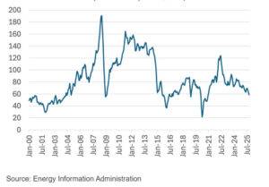 Krugman también cuestiona la creencia de Trump de que el petróleo en el subsuelo es un activo preciado, porque está barato según estándares históricos. Este es el precio real del petróleo —ajustado a la inflación general— desde el año 2000: