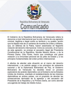 La ambigüedad de esta relación restalla en el comunicado oficial del gobierno venezolano. Comienza por denunciar una agresión criminal e ilegítima y como presunta consecuencia termina anunciando que se comenzó a explorar el restablecimiento de relaciones diplomáticas. El objetivo sería abordar las consecuencias de la agresión y el secuestro "del presidente de la República y de la Primera Dama" y "una agenda de trabajo de interés mutuo".