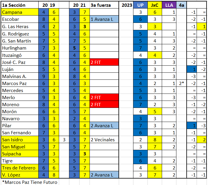En la Primera, de las 45 sillas perdidas por el bipartidismo, LLA se quedaría con 43 (sólo General Las Heras, Navarro y Suipacha carecen de su representación). Las otras dos serían para el vecinalismo del Movimiento Evita, que se quedó con más del 20% de los votos luego de que no se le diera lugar en el armado oficial, como se detalló en la nota Internas conurbanas.