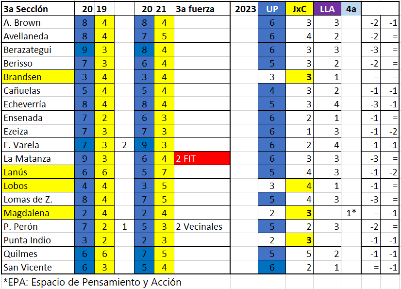 Análogo corrimiento se dio en la Tercera, donde no tendrán sillas los distritos de menor densidad poblacional como Punta Indio y Magdalena, donde la disidencia se manifiesta en el armado llamado EPA (Espacio de Pensamiento y Acción), que ingresó un edil.