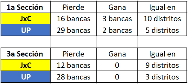 Con el resultado de las PASO, las siguientes serían las pérdidas y ganancias en la suma de todos los municipios, aunque separados por Sección. Nótese que es muy alto el porcentaje de distritos donde se mantienen los niveles respecto de hace cuatro años: 10 de 24 en la Primera, para Juntos, y 9 de 19 en la Tercera.