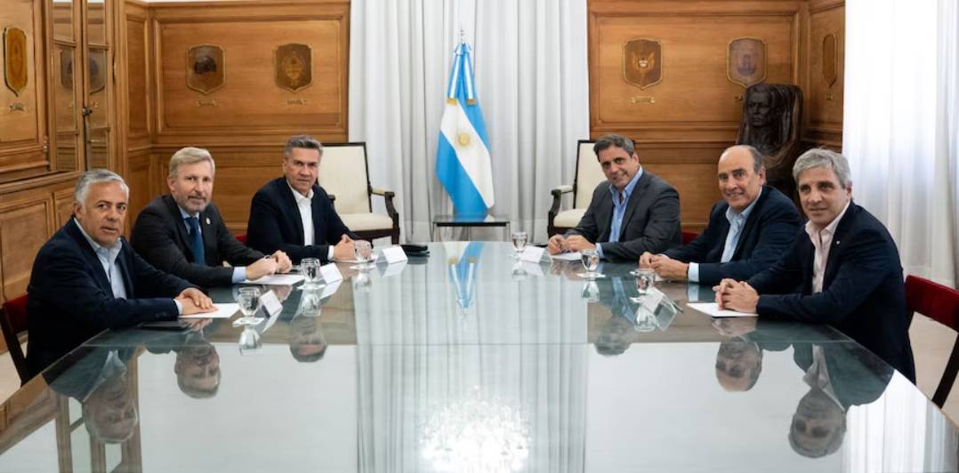 Del breve convite también participó el ministro de Economía, Luis Caputo. Un día antes había publicitado su foto con el gobernador chubutense Ignacio Torres, con quien firmó un convenio de cancelación de deudas recíprocas. Pero Torres no se sentó a la mesa.