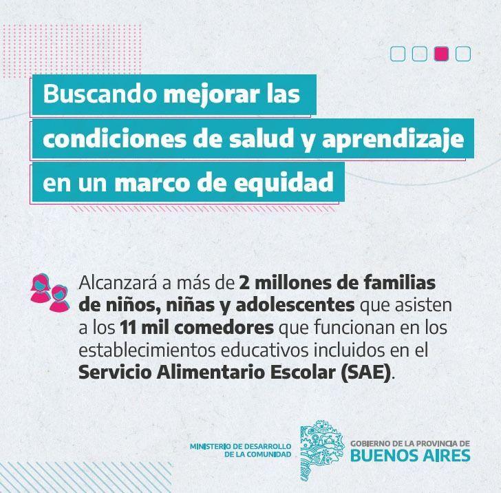 El director general de Cultura y Educación bonaerense expresa “que es un programa en el que ha dado una mano grande la Nación, por eso estaba (en el acto) Juan Zabaleta, el ministro de Desarrollo Social de la Nación”. Destaca que el programa se acompañará “de un cuaderno guía, que cuenta con información nutricional de recetas saludables, confeccionado por el equipo de la Dirección de Nutrición y Calidad de los Alimentos del Ministerio de Desarrollo de la Comunidad” de la provincia de Buenos Aires. Para Sileoni, se trata de una “política pública que evidentemente es necesaria. Algún día dejará de ser tan acuciante, pero hoy por hoy es necesaria y muy apreciada por los intendentes, que con mucha preocupación nos preguntaban si iba a continuar. Hay una decisión del gobernador muy clara, que es no solo continuarlo, sino resignificarlo. Nos parece que es un paso adelante”.