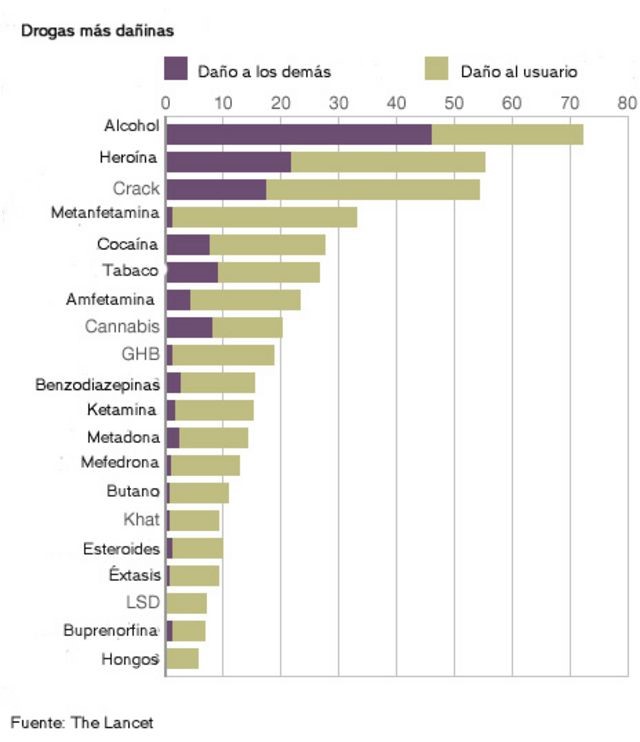 David Nutt es director del Comité Científico Independiente sobre Drogas y creó una clasificación según la peligrosidad de las sustancias. Ponderó para ello lo que dio en llamar “daño combinado”, que es la mixtura entre el daño que el usuario se infringe a sí mismo y el daño social que potencialmente puede causar. Trabajó con 20 drogas y sustancias de abuso, observando 16 factores, 9 daños individuales y 7 daños sociales, entre los que se destacan: salud mental, daños físicos, daños familiares, adicción, costo a la economía y crimen, entre otros. Su investigación estipuló que el alcohol es tan peligroso como la heroína y el crack.