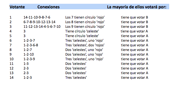 Sin embargo, sigamos las reglas que escribí más arriba: cada uno va a votar de acuerdo a lo que vote la mayoría de las personas conectadas con cada uno. Acompáñeme y hagamos las cuentas de lo que debería hacer cada votante.