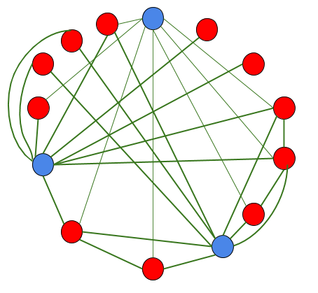 Por ejemplo, para fijar las ideas, una persona identificada con un círculo ‘rojo’, en principio, debería votar al candidato B. Pero si sucede que esta persona está conectada con siete círculos, y cuatro de ellos son celestes, entonces votará al candidato A (‘celeste’), ya que la mayoría de sus conocidos/familiares/amigos) tiene un círculo celeste.
