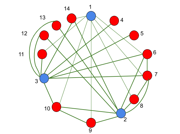 La Figura 1 contiene toda la información necesaria que quiero comunicar. Cada círculo representa una persona (o votante). Dos personas que se conocen (o son familiares o amigos) están conectadas por un segmento que une los dos círculos. Personas que no estén conectadas por ningún segmento, es porque no se conocen.