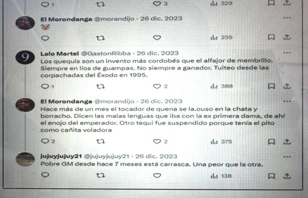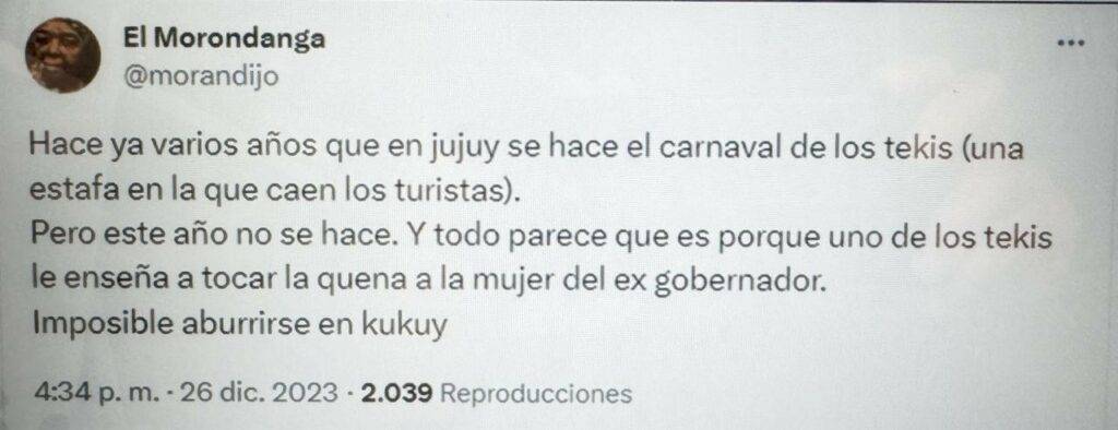 El 26 de diciembre de 2023, Nahuel Morandini, un docente universitario, publicó un posteo alusivo a los rumores usando el pseudónimo “Morondanga” en su cuenta X (ex-Twitter). El posteo decía: “Hace ya varios años que en Jujuy se hace el carnaval de los tekis (una estafa en la que caen los turistas). Pero este año no se hace. Y todo parece que es porque uno de los tekis le enseña a tocar la quena a la mujer del ex gobernador. Imposible aburrirse en kukuy”. Luego también respondió a uno de los comentarios con el siguiente texto: “Hace más de un mes, el tocador de quena se la o.uso (sic) en la chata y borracho. Dicen las malas lenguas que iba con la ex primera dama, de ahí el enojo del emperador. Otro tequi fue suspendido porque tenía el pito como cañita voladora”. El posteo haría referencia a Morales y a Snopek, aunque ninguno de ellos estaba nombrado en el mensaje.