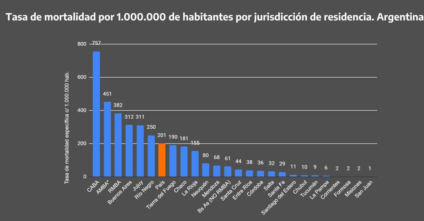 Si consideramos la tasa de mortalidad (757) pasa lo mismo. (La tasa de mortalidad surge de multiplicar el número de fallecidos por un millón y luego dividirlo por la población total.) La Ciudad tiene la tasa más alta que es tres veces y media mayor a la tasa de mortalidad promedio país (201). A su vez la tasa de letalidad (número de fallecidos dividido por el número de infectados y multiplicada por 100) es de 2.5% en la Ciudad que también es más alta que la tasa promedio país (2.1%). Y no sabemos si la variedad genética del virus dominante en la Ciudad es más letal y de mayor expansión que otras variantes que puedan estar circulando en el país.