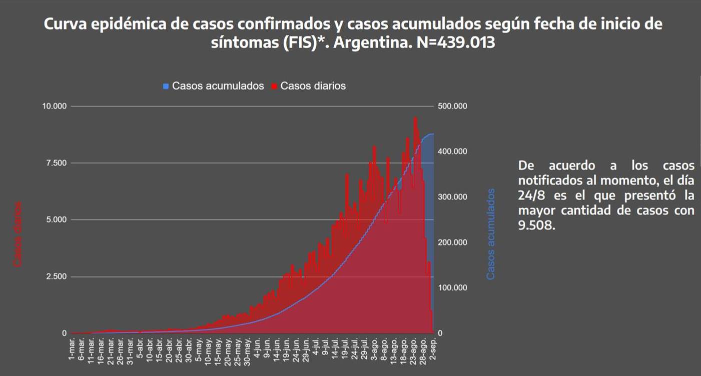 La curva epidémica de casos confirmados y acumulados en el país no se ha detenido en su ascenso. Hasta el 2 de septiembre, esa curva registraba al 24/8 como el día con mayor cantidad de casos con 9.508, pero en el informe diario del 4 de septiembre, el Ministerio informó que el 3/9 se habían confirmado 12.026 casos nuevos. La curva seguía en ascenso sin meseta alguna a nivel nacional. Y se sabe: a más infectados más enfermos, más enfermos graves y más muertes.