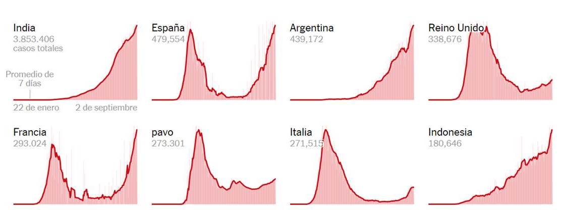 Ahora bien, si observamos la situación de la pandemia en el mundo al día 4 de septiembre, el país que tenía el mayor promedio de casos diarios por cada 100.000 habitantes era Argentina con 23 y un promedio de 10.129 casos diarios.