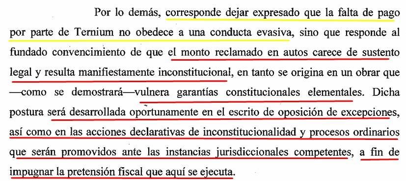 En la contestación que realiza el patrocinante de Ternium-Siderar ante el Juzgado de Paz de Ramallo, se deja constancia de que la actitud de Paolo Rocca será la de seguir insistiendo en el Poder Judicial porque consideran que “el monto reclamado carece de sustento legal y resulta manifiestamente inconstitucional”. Por ese motivo, sostienen que realizarán “acciones declarativas de inconstitucionalidad y procesos ordinarios que serán promovidos ante las instancias jurisdiccionales competentes, a fin de impugnar la pretensión fiscal que se ejecuta”. Como si no resultara su actitud a todas luces una maniobra evasiva, para oscurecer aclaran: “Corresponde dejar expresado que la falta de pago por parte de Ternium no obedece a una conducta evasiva”. ¡Menos mal!