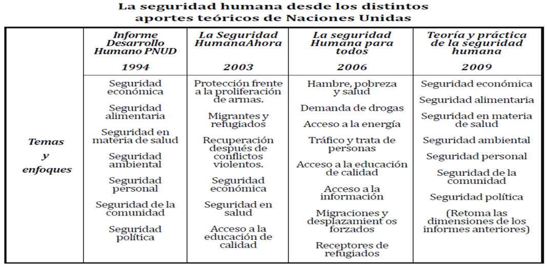 En este contexto, reseñan los autores, en el Informe Anual de Desarrollo Humano de la ONU del año 1994 se propuso “transitar hacia un nuevo paradigma de seguridad”. Desde entonces, se ha promovido en diferentes instancias internacionales el concepto de “seguridad humana”, que incluso ha tenido diferentes aproximaciones por parte de esta organización y que estos autores sintetizan en el siguiente cuadro: