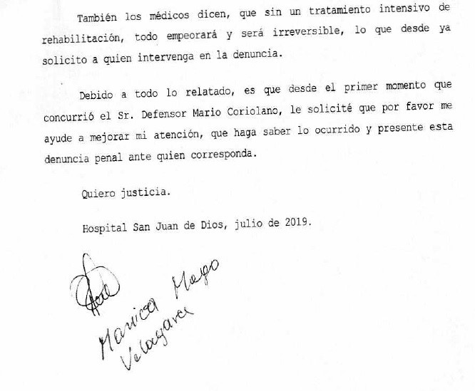 “Me presento ante Usted para que investigue los hechos de desatención médica, maltratos, sufrimientos psíquicos, dolores físicos y negligencias que me dejaron paralítica, con uso de pañales y una sonda de por vida para controlar mis necesidades”, dice la denuncia que el 5 de julio presentó ante la fiscalía general de La Plata el abogado Aníbal Hnatiuk, de la Defensoría de Casación.