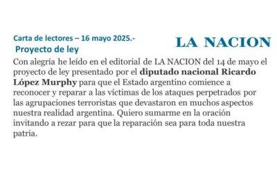 Al día siguiente, el 16 de mayo, Olivera tuvo otra alegría. El diario La Nación le publicó una carta de lectores en la que celebró “el proyecto de ley presentado por el diputado nacional Ricardo López Murphy para que el Estado argentino comience a reconocer y reparar a las víctimas de los ataques perpetrados por las agrupaciones terroristas”. La misma agenda de Asunción, que mereció estar en esa misa.