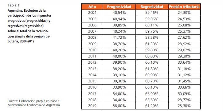 En 2015, la presión tributaria en el país era del 31,45 por ciento del PBI, la cual fue bajando durante todo el macrismo hasta ubicarse en el 28,38 por ciento en 2019, según la investigación del CEPA. El principal sesgo de esta “presión” es que priman los impuestos regresivos sobre los progresivos.