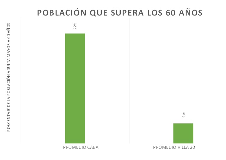 La informalidad en el acceso a los servicios sanitarios determina un doble estándar sanitario, que explica por qué mientras el promedio de los habitantes de la Ciudad que superan los 60 años es del 22%, en la Villa 20 sea sólo del 4% y en el barrio Ramón Carrillo sólo del 8%.