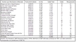 De todas formas con el comportamiento de la timba financiera global hay que ser cuidadoso. Al respecto, un caso reciente resulta muy ilustrativo. El viernes 10 de enero el sureste de Australia seguía prendido fuego. Los incendios forestales sin precedentes habían producido 27 muertos y reducido 2.000 viviendas a cenizas y arrasado con esa singular flora y fauna. Ese mismo día el mercado de valores de Australia que venía entre los más rendidores del planeta, alcanzó un récord. El índice de referencia S & P / ASX 200 había subido casi un 1% para cerrar en 6929, superando el récord intradiario anterior. El índice había subido cerca del 3% esa semana y 3,7% en lo que iba del año. Según los datos de la consultora FactSet fue récord mundial, superando al otro índice que más había subido: el IPSA de Chile. Los inversores encuentran baratas las empresas chilenas y confían en que el orden político reaccionario y conservador finalmente se impondrá. El tiempo dirá si tienen o no razón. En cuanto a las 200 empresas que cotizan en Australia compendiadas por el índice ASX, 138 aumentaron durante la sesión del viernes 10 de enero. El fuego se estaba comiendo una parte importante de Australia mientras los informes de ventas minoristas las mostraban consolidadas y al alza y China, el más importante socio comercial de los canguros, anunciaba medidas de estimulo a su gigantesco mercado con impacto directo en la oferta exportable australiana. Ahora, con el coronavirus, S&P Global no ha hecho más que aplicar la lógica de este comportamiento a la bolsa de Nueva York, por muy lejos la más voluminosa del mundo, y considerar los promedios históricos calculados sobre shocks previos del mercado, tal como los que informa el siguiente cuadro: