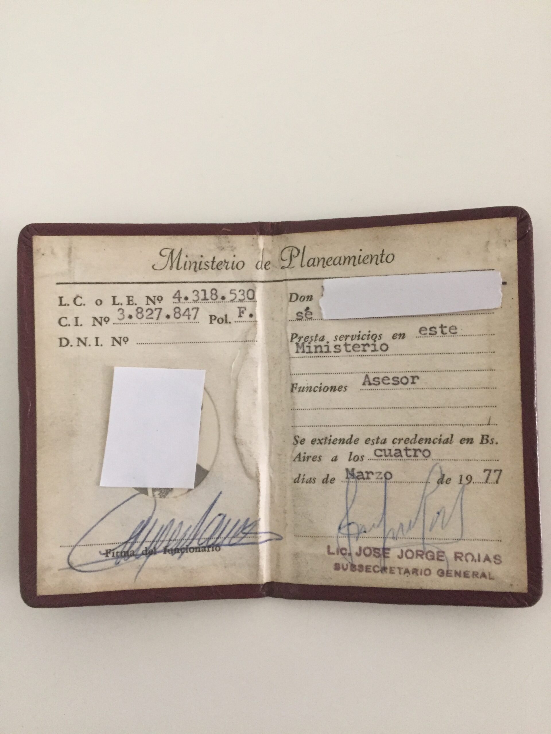 En un momento una de las chicas me enseñó un documento, para saber si lo tiraba o no. Era un carnet estilo librito, como los de antes. En la tapa de cuero o material similar decía Poder Ejecutivo Nacional. Me llamó la atención y lo abrí. Le pertenecía a mi tío, el hermano menor de mi madre. Con quien ya no tengo relación, porque se mudó a los Estados Unidos el siglo pasado y porque sus ideas —era supernumerario del Opus Dei— cavaron un abismo entre su persona y la mía. El carnet reveló que había sido asesor del Ministerio de Planeamiento, lo cual no me sorprendió, porque es economista. En ese trance le dije a mi hija que no lo tirase, lo cual ahora, con la perspectiva que activan los días, sí encuentro sorprendente. Durante esa tarde me había desprendido de múltiples chucherías de mis padres, a los que amé. ¿Qué sentido tenía conservar el documento de alguien que significaba poco o nada para mí?