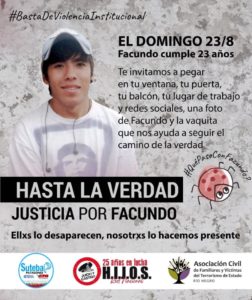 En tanto, sus vecinos y otras voces solidarias, este domingo 23 en que Facundo hubiera cumplido años, se harán oír desde concentraciones en varias localidades del interior rural. El mismo día se cumple un mes de que Franco fue visto por última vez en el Conurbano. Unos y otros compartirán un clamor común: saber qué hicieron con ellos.