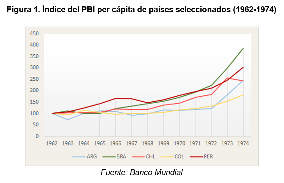 Observemos entonces qué sucede por períodos. Partiendo de 1962, como dijimos, la Argentina se ubicaba como el país líder del grupo alcanzando los 1.155 dólares  [1] per cápita. Le seguía Chile con 639 y lejos se encontraban Perú, Colombia y Brasil, rondando los 300 dólares. En la Figura 1 podemos observar cómo creció cada país partiendo de esa base. Vemos que hasta 1974 se dio una tendencia similar entre todos, con un proceso de catching-up para Brasil (con este mayor crecimiento superó a Colombia y Perú del fondo de la tabla). Mantenía todavía Argentina el liderazgo casi duplicando al segundo puesto (2.844 dólares versus 1.544 de Chile y 1.004 de Brasil).