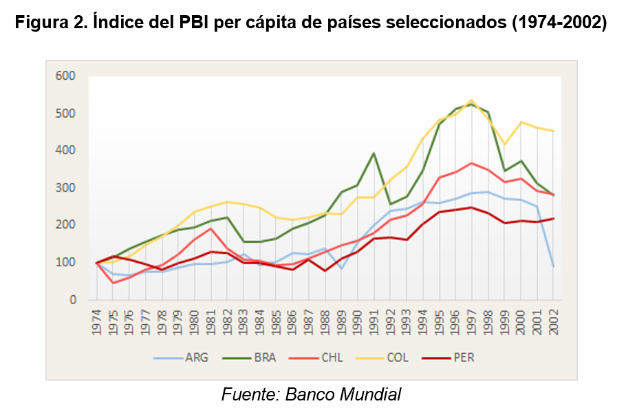 La historia cambia, para mal, a partir de 1975. En la figura 2 podemos observar cómo durante tres décadas, el crecimiento de Argentina se ubicó por debajo del resto (con la breve excepción del trienio 1990-1992). Además, las dos mayores crisis de su historia (hasta la pandemia) se dieron en este ciclo, con caídas récord en 1989 y 2002, lo que da lugar a un resultado catastrófico: Para el 2002 el PBI per cápita se encontraba por debajo de su valor en el ‘74 y había pasado a disputar un modesto tercer puesto con Colombia, detrás de Chile (4.400 dólares) y Brasil (2.800 dólares).