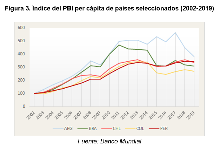 Finalmente incluimos en una tercera etapa los años acontecidos a partir del 2003, donde podrían distinguirse tres momentos: un crecimiento mayor a los demás países del grupo hasta el 2011, un estancamiento posterior hasta el 2017, y una nueva crisis de magnitud en 2018 y 2019 (que se profundizaría en 2020 al calor de la pandemia y la crisis de deuda). En la figura 3 vemos este devenir, con un importante dato: pese a los magros resultados post-2012, la Argentina lideró al grupo tomando el período en totalidad. Revirtiendo parcialmente la situación antes mencionada, para el 2019 el PBI per cápita alcanzaba los 9.900 dólares, debajo de Chile (14.900) pero nuevamente encima de Brasil (8.700).